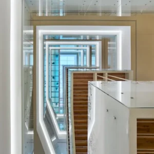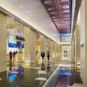 Its grand lobby features a striking 140-foot LED ceiling that displays dynamic visual effects.